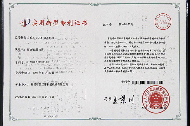 切石機(jī)吸盤機(jī)構(gòu)實(shí)用專利證書