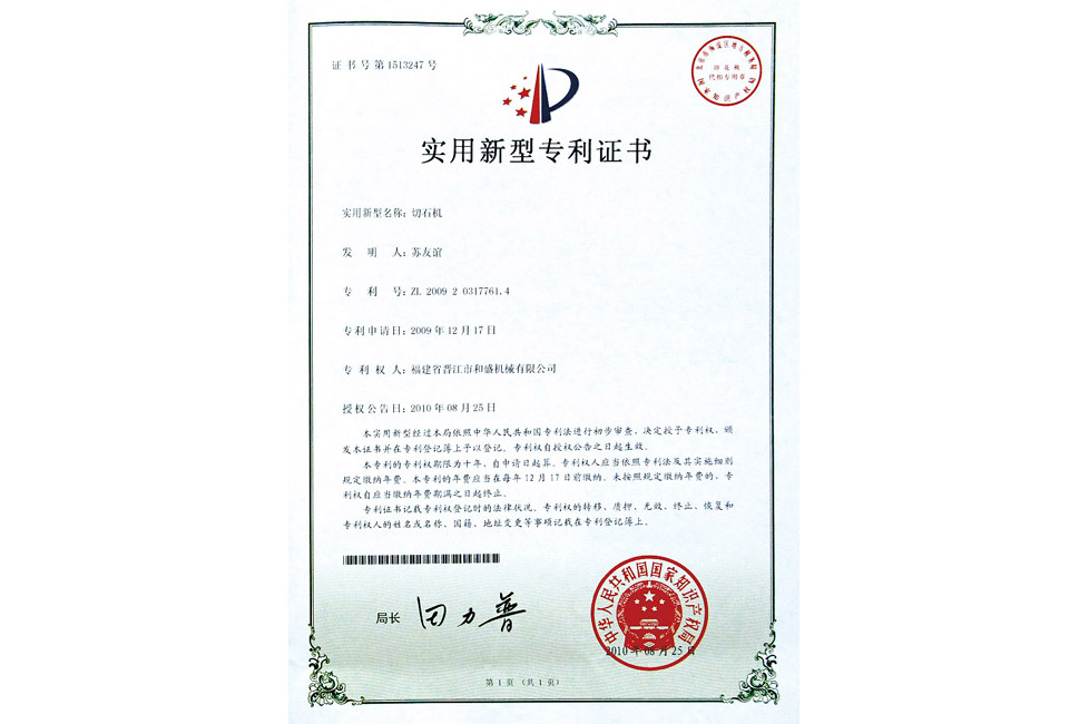 切石機(jī)實(shí)用專利證書